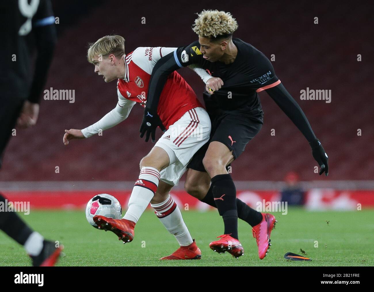 London Grossbritannien Februar 2020 Matthew Smith Von Arsenal U23 Und Felix Nmecha Von Manchester City U23 Kampfen Beim Spiel Der Premier League 2 Zwischen Arsenal Unter 23 Jahren Und Manchester City Unter