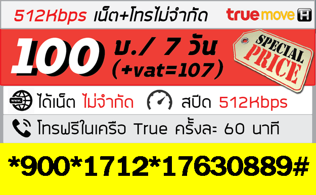 เน ตทร รายส ปดาห 100 บาท 512k ไม ลดสป ด โทรฟร ทร ไม อ น 100 บาท 7 ว น ราคาเต ม Vat 107 บ เน ตทร รายส ปดาห สป ด 512kbps คงท เล นได ไม อ นนาน 7 ว น พร อมโทรฟร ทร ม ฟ เอช ได ไม จำก ด 60 นาท คร ง สม ครกด 900 1712 17630889 โทรออก
